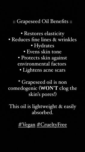 Grapeseed oil is widely known for helping to keep skin youthful, soft, & preserved! Has Omega-6 fatty acids & antimicrobial properties!
